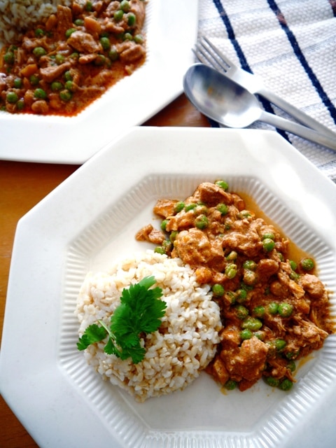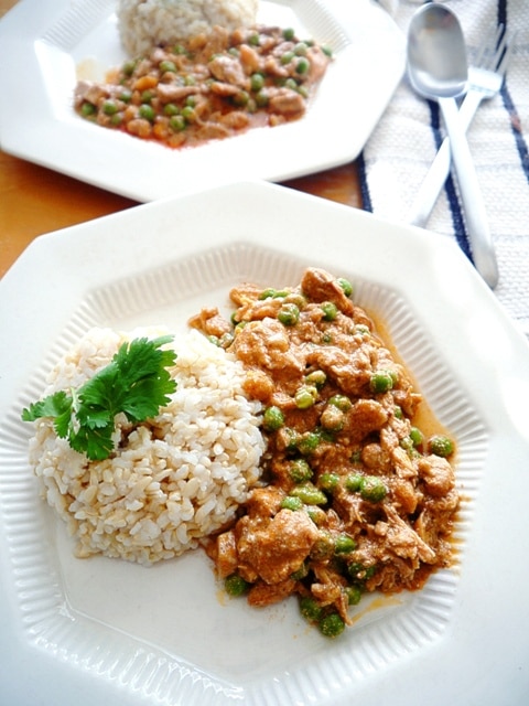 Later that day I tasted my crockpot Thai chicken curry, added some fish sauce and sugar to balance the flavors, threw in some frozen peas that were hiding in the freezer, and after they had warmed, I put ladled up the curry for dinner.