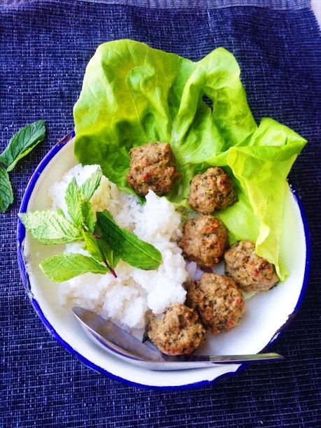 I already have a recipe for larb on my blog, which I love to make too. But my Thai Hubby loves meatballs, and gave me the idea to make Thai Laarb Meatballs and put them in lettuce wraps. He is brilliant! One of the many reasons I love him.
